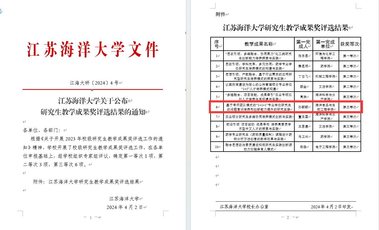 近日,公司公布2023年校级研究生教学成果将评选结果,公司孙颖颖教授主持的《基于导师团队模式的“1+1+1”专业学位研究生的问题意识培养和创新能力提升的研究实践》项目喜获第三等次。该成果完成人为孙颖颖、郑世燕、朱强、侯晓月、杨光、刘骁、韦欣。
