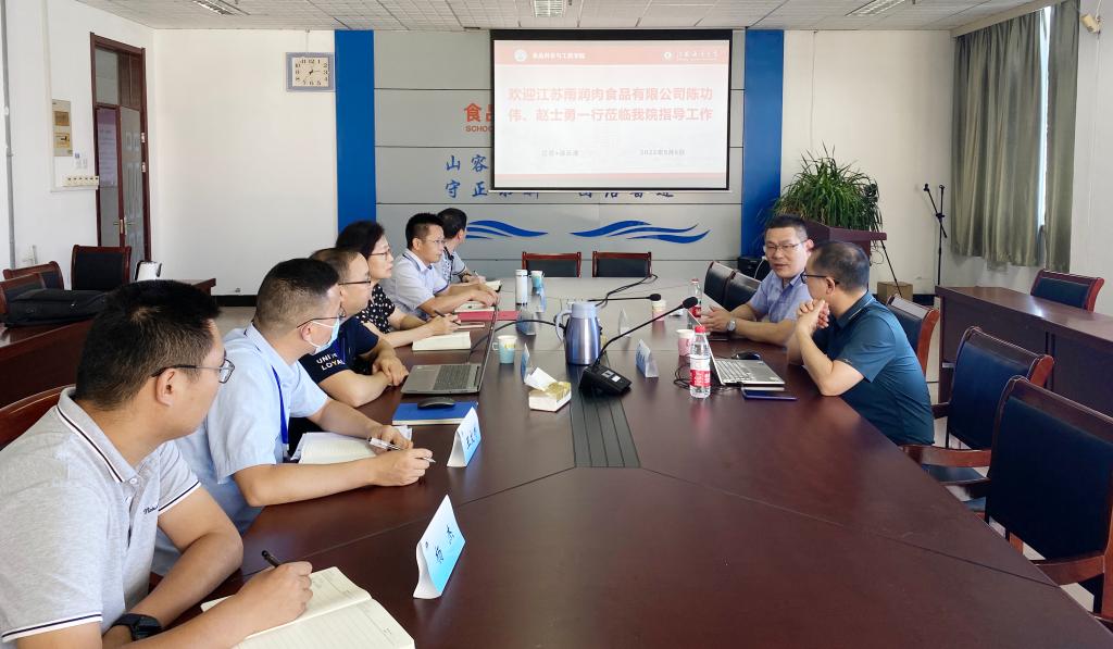2022年9月6日下午,江苏雨润肉食品有限公司人力资源部部长陈功伟,连云港福润食品有限公司总经理赵士勇一行到公司洽谈人才培养、技术开发合作相关事宜。经理王淑军,副经理盘赛昆、吴少杰及骨干教师出席洽谈会,会议由王淑军主持。