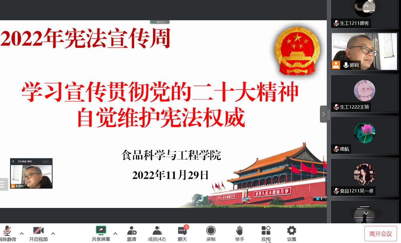 为认真学习宣传宪法,弘扬宪法精神,维护宪法权威,进一步营造学习宪法、民法典、教育法以及疫情防控等相关法律法规的浓厚氛围。11月29日晚上,在第9个国家宪法日到来之际,bevictor伟德在线上举办“学习宣传贯彻党的二十大精神,自觉维护宪法权威”宪法宣传周专题讲座。公司党总支副书记郭利主讲,2022年青马工程培训班全体学员参加。