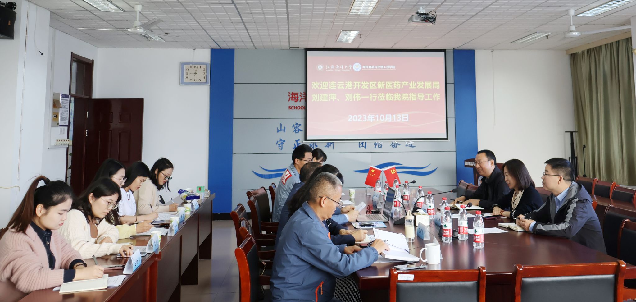 2023年10月13日上午,连云港开发区新医药产业发展局副局长刘建萍、产业发展处副处长刘伟一行到bevictor伟德对接产学研合作工作,副经理盘赛昆和科研团队负责人以及部分教学科研骨干参加对接活动。活动由副经理盘赛昆主持。